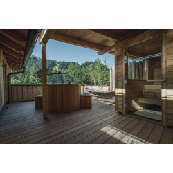 After a full day of outdoor experiences in the mountains of Salzburg province, mama thresl hotel awaits you with the luxury of cosiness and comfort in all rooms: to unwind, refuel, surf, chill out, freshen up…and of course to sleep. You can look forward to the exquisite scent of native pine wood which our hotel rooms are made out of. It is fragrant and does wonders for the body and the soul. In the rock showers, you will find pure refreshment. Of course, there is also complementary high speed WLAN, flat screen TV, a room safe for your valuables, a separate toilet and a balcony with a view of the mountains. For winter sports enthusiasts and mountain bikers, our hotel is extremely practical: every hotel room has its own ski and bike storage in the basement, with integrated shoe and clothing dryers. This way your sport equipment is safely stored and your outdoor clothing is dry in the morning Some rooms have – perfect for relaxation – a free-standing bath tub with a view of the Pinzgau mountains on the eastern edge of the Kitzbühel Alps. And if that’s not enough, other rooms closer to the rooftop entice you with an exclusive sky terrace, a private hot tub, private sauna and a magical view of the Asitz