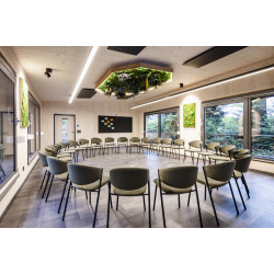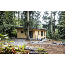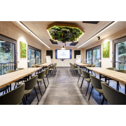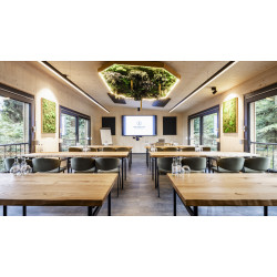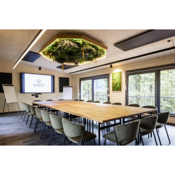 The "Waldräume" consist of modern, light-flooded cuboids in the middle of the forest and can accommodate up to 45 people. Flexible seating options—from theater to circle seating—allow for individual setups for seminars, workshops, and lectures. Large sliding windows open up views of the greenery, while the scent of wood and the natural surroundings promote concentration, creativity, and relaxation. Facilities include state-of-the-art conference technology, Wi-Fi, inspiring outdoor areas for group work, and individual support from the event team.